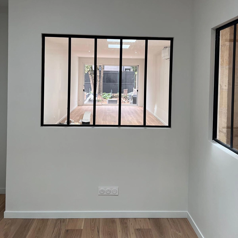 Extension et redistribution complète : sols, plafonds, éclairage et finitions pour une pièce de vie moderne et cohérente.